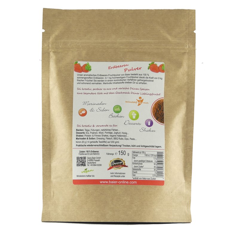 Erdbeer-Fruchtpulver von Baier besteht aus 100 % sonnengereiften Erdbeeren. In 1 kg unseres hochwertigen Fruchtpulvers steckt die Kraft von 9 kg frischer Früchte! Sie werden in einem kontrollierten Verfahren gefriergetrocknet und schonend vermahlen. Wertvolle Inhaltsstoffe wie Vitamine, sekundäre Pflanzenstoffe und Mineralstoffe bleiben so optimal erhalten.