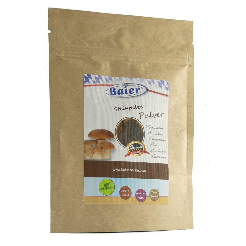 Steinpilzpulver von Baier besteht aus 100 % handgepflückten wildwachsenden Steinpilzen. In 1 kg unseres hochwertigen Fruchtpulvers steckt die Kraft von 9 kg frischer Edelpilze! Sie werden in einem kontrollierten Verfahren gefriergetrocknet und schonend vermahlen. Wertvolle Inhaltsstoffe wie Vitamine, sekundäre Pflanzenstoffe und Mineralstoffe bleiben so optimal erhalten.